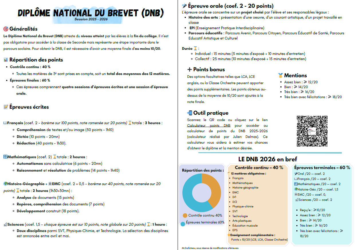 Afin d’accompagner au mieux les élèves et leurs familles, nous avons créé un outil pratique rassemblant toutes les informations essentielles sur le nouveau DNB 2026. Ce document présente les modalités du diplôme telles que connues à ce jour (répartition des points, nature des épreuves, mentions possibles, etc.), sous réserve de modifications ultérieures.